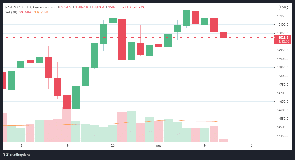 After having peaked at 15124 on Aug 9, the NASDAQ price retraced slightly and began flirting with the 15000 mark which is psychologically significant. As indicated, the market’s reaction to the passing of the Infrastructure Bill has been slightly muted but one has to wait to see what exactly happens.