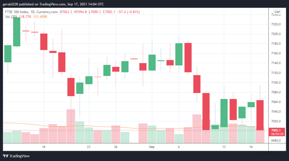 - FTSE gives up most of its weekly gains and settles at the 7000 mark with a 0.8% decline