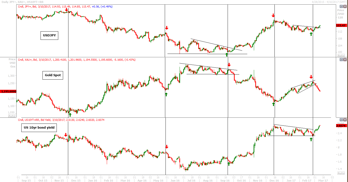 Intermarket analysis between USDJPY, Gold spot and the US 10yr yield.