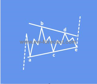 A Triangle is a common 5-wave pattern labeled A-B-C-D-E that moves counter-trend and is corrective in nature. Triangles move within two channel lines drawn from waves A to E, and from waves, B to D. A Triangle is either contracting or expanding depending on whether the channel lines are converging or expanding. Triangles are overlapping five wave affairs that subdivide 3-3-3-3-3, in some cases a leg E can be a triangle itself.