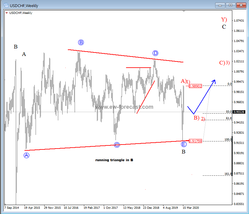 On the weekly chart of USD/CHF, we can see that price was for the last five years making a sideways, and overlapping price activity; an Elliott wave running triangle in B. This triangle can now be completed based on latest sharp recovery from the 0.9176 level, where a low was put into place. If that is the case, then be aware of a minimum three-wave recovery above the 1.023 zones for a higher degree wave C, in weeks/months to come.
