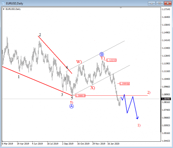 EURUSD has ended a big, bearish cycle down from 1.256 area, with an Elliott wave ending diagonal in the final piece of a bigger wave A impulse at the 1.087 low. Price then followed with a correction in a wave B and found resistance at the 1.122 level from where a new sharp drop is now unfolding, and it may reach more weakness after any short-term rally. The trend may go sideways on a daily close above 1.1.