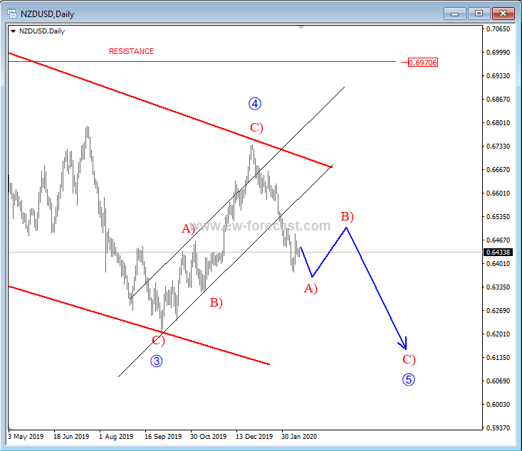NZDUSD is in a clear, bearish pattern down from 0.674 high, now trading in the middle of an impulse. We labeled waves 1-2 and 3 already completed, so latest recovery from the 0.6377 lows can be only a wave 4 correction within the trend, which can face resistance/bearish reversal at the 0.650 region, also region of ther former wave iv of one lesser degree and region where Fibonacci ratio of 38.2 can react as a turning point.
