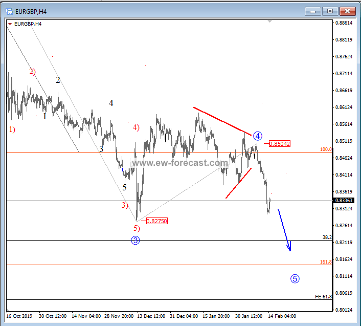 EURGBP made a recovery from the 0.827 area, which we labeled it as part of a higher degree wave 4 corrections, and which resulted in a triangle. We can see that the price completed its correction at the 0.854 level, from where a strong drop started developing. This drop can be part of a wave 5, which can target the 0.820/0.808 region with its five-wave structure. That said, be aware of temporary pullbacks within a fifth wave.