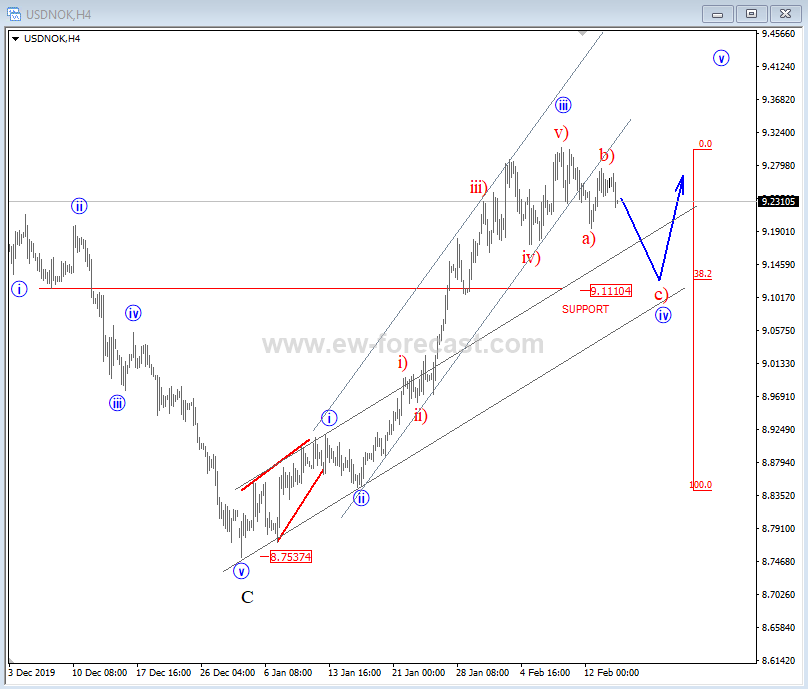 On USDNOK we see a bullish cycle in progress, with price currently slowing down for a temporary wave iv correction. Wave four represents a pause within the trend, and in our case, it can reach the 9.19/9.11 possible support region, where Fib. The ratio of 38.2, the lower base channel line, and the 9.11 level of a former swing low can slow the bears down, and push the price into a new and final wave v.
