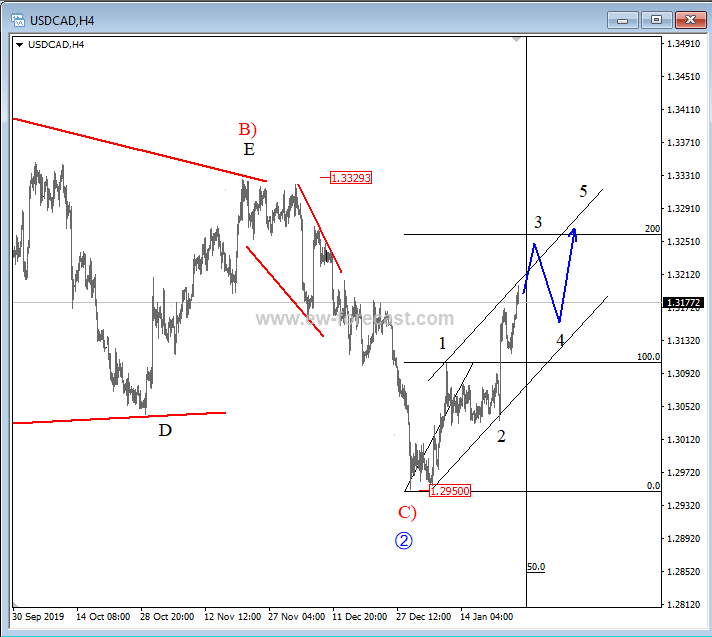 On the daily chart of USDCAD we can see that price made a big converging price action within a wave 1 up from 2017; an Elliott wave leading diagonal which found a top at the 1.366 level and started reversing into a corrective retracement. We labeled a fully completed wave 2 corrections, which unfolded a zig-zag: an impulse in legs A) and C), and a triangle in a wave B). A low for the correction was later seen at the 1.294 level, from where a new rise started developing.