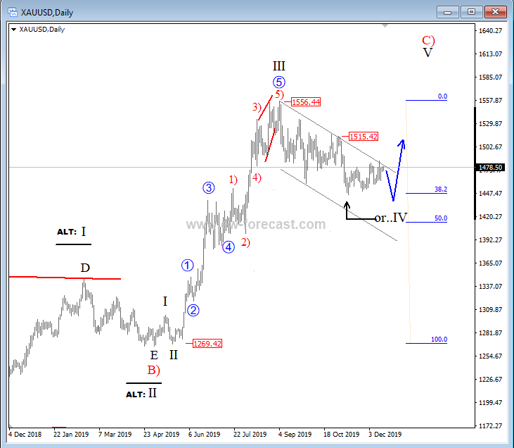 On the 4h chart of Gold we labeled two possible fourth wave endings; the #1 shows sub-wave B) of Y which can be ending, so be aware of further downside into sub-wave C), towards the 1440/1420 region. A drop below the lower corrective channel line connected from the low of wave A) would be further evidence that wave B) is completed, and that wave C) is underway. The #2 is showing a possibly completed wave IV already at the 1445 level.
