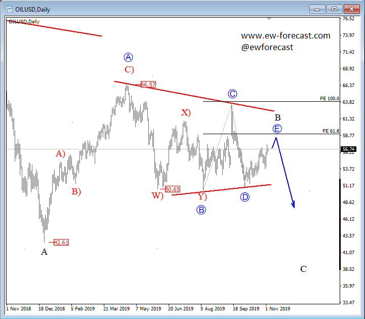 Crude oil jumped towards 63.00 zones and tested the upper side of a 2019 trading range where upside was limited, and a new leg lower started developing. We labeled that same leg down as wave D, as part of a bigger complex correction, which fully developed and pushed the price into the final leg E of a triangle structure, towards the 57.00 regions. Potential resistance/bearish turn for oil can now be near the 58.0/59.50 zone.