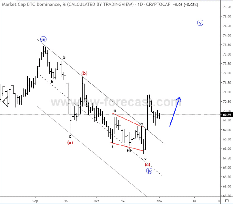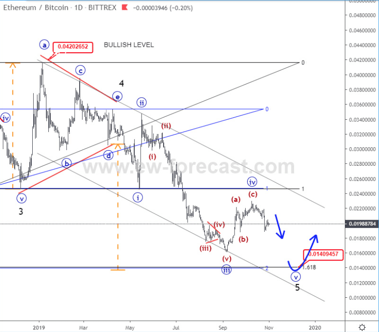 BITCOIN and most of the ALTcoins have seen a deeper decline in the last couple of months, mainly because BTC has been losing its dominance. But, after that strong BTCUSD bounce, it seems like BTC Dominance is back, especially if we take a look in the BTC.D chart in which we see a corrective decline from the highs. So, we believe that BTC Dominance might be back in the game and BTCUSD may outperform ALTcoins again which can be clearly seen in the ETHBTC chart. As you can see, we are still tracking a corrective wave »iv « here that can send the price back to the lows for wave »v « of 5 towards 0.014 area.