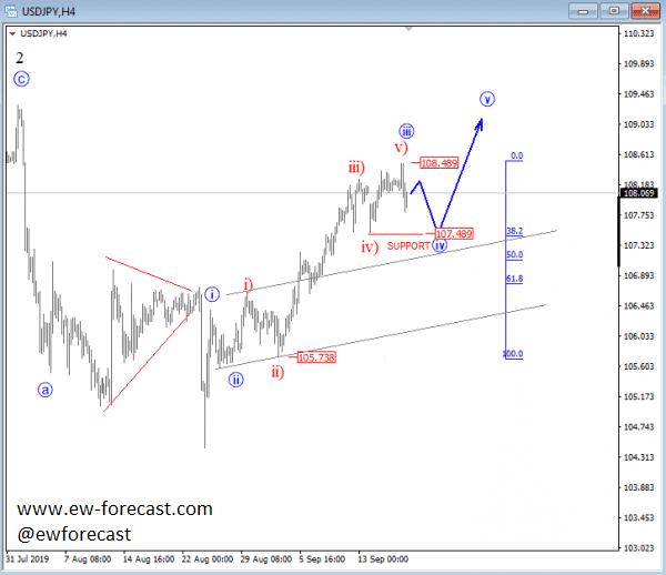 On USDJPY we are tracking part of a bigger triangle correction which can be fully visible on the weekly chart but is still incomplete. We were tracking a three-wave reversal down from 114.54; a move that can be coming to an end if we consider recent quite strong and extended bounce from 104.40 and now above 108.00. Ideally, that’s part of another three-wave structure higher into wave D.