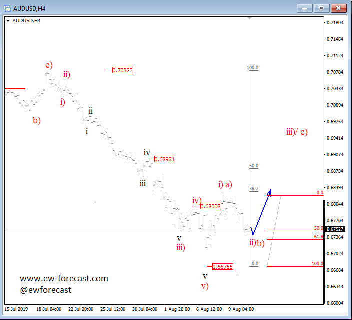 Bigger, bearish, impulsive structure (meaning with five legs) on Aussie can be completed, as we see a sharp recovery from the 0.668 regions, which can already be part of a three-wave reversal. The current three-wave move can take price towards 0.6898 minimum target region, however once minor wave b)/ii) correction fully develops.