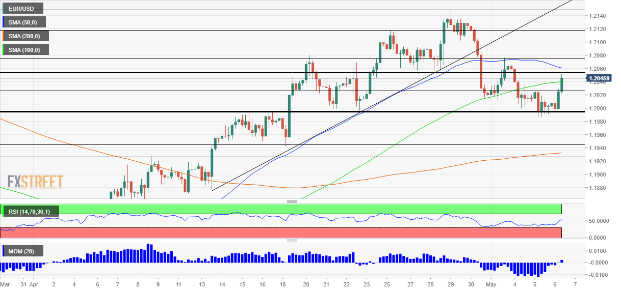 Euro/dollar has topped the 100 Simple Moving Average on the four-hour chart and momentum has flipped to the upside – both bullish developments. It is still below the 50 SMA , which is the first resistance line, at 1.2060.