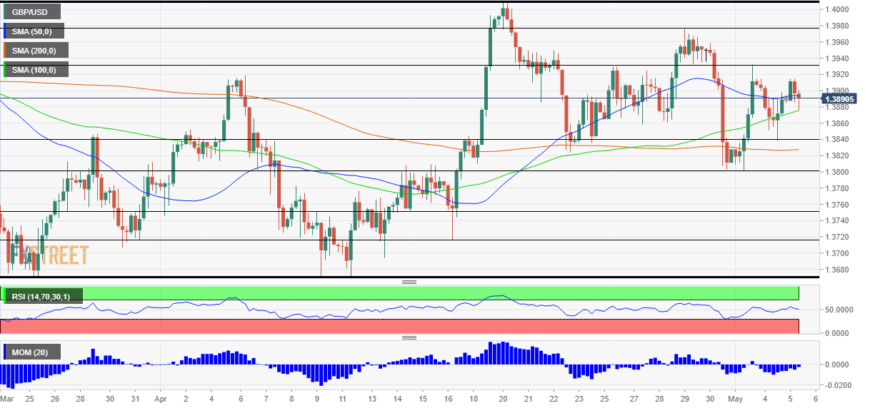 Pound/dollar is battling the 50 Simple Moving Average on the four-hour chart, but trades above the 100 and 200 SMA. On the other hand, momentum remains to the downside. All in all, the picture is mixed.