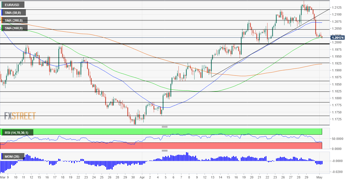 Some resistance is at 1.2050, a support line from last week, and then by 1.2080 and 1.2117, both swing highs on the way up. The April peak of 1.2150 is the next level to watch.