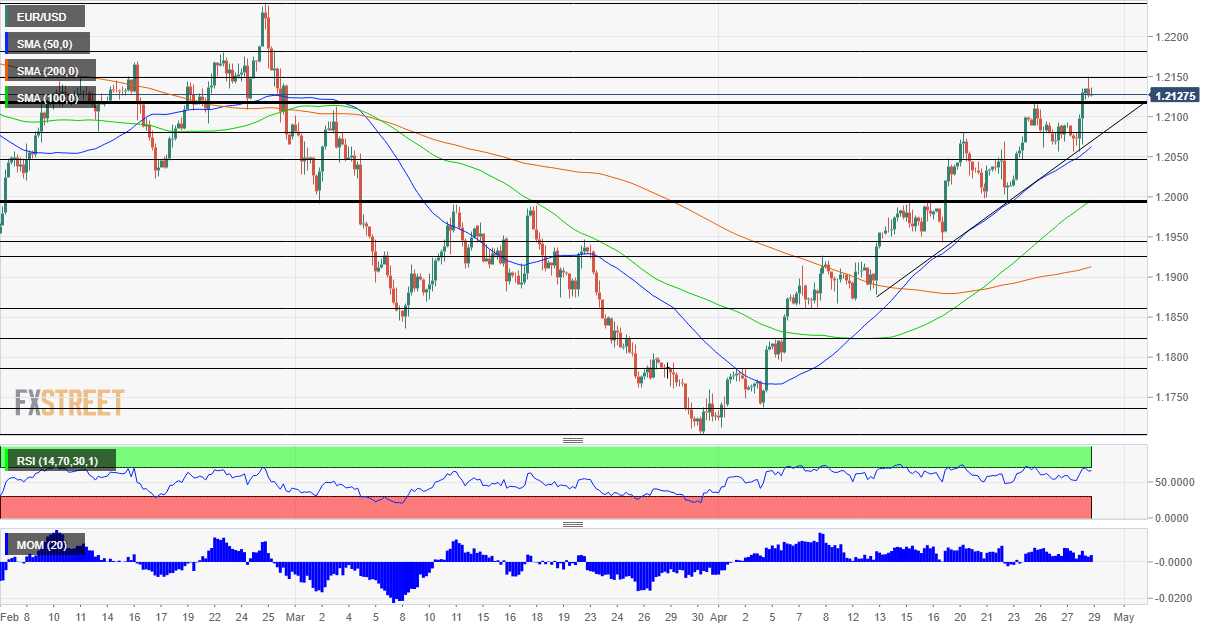 The fresh April high of 1.2150 is the immediate resistance line. It is followed by 1.2180 and 1.2240, levels last seen in February.