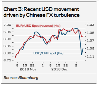 The squeeze of short CNH positions is also one of the reasons for the upward move in the EUR/USD in our view, together with Fed worries about the strength of the USD in the minutes from the meeting in December.