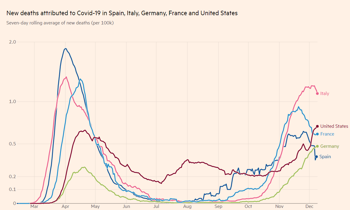 The continent is preparing for the Christmas holidays with fear that travel and family mixing would contribute to the disease’s spread. Governments are torn between enabling the economies to breathe – which would be euro-positive – to halting infections, which would help the recovery. Decisions in Germany and France are of importance to the common currency.