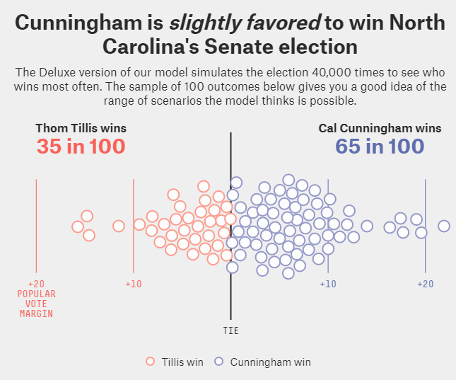 The opposition party’s best shot is in North Carolina, where incumbent Republican Thom Tillis marginally behind Democratic challenger Cal Cuningham. According to FiveThirtyEight, Cuningham is only “slightly favored” to win: