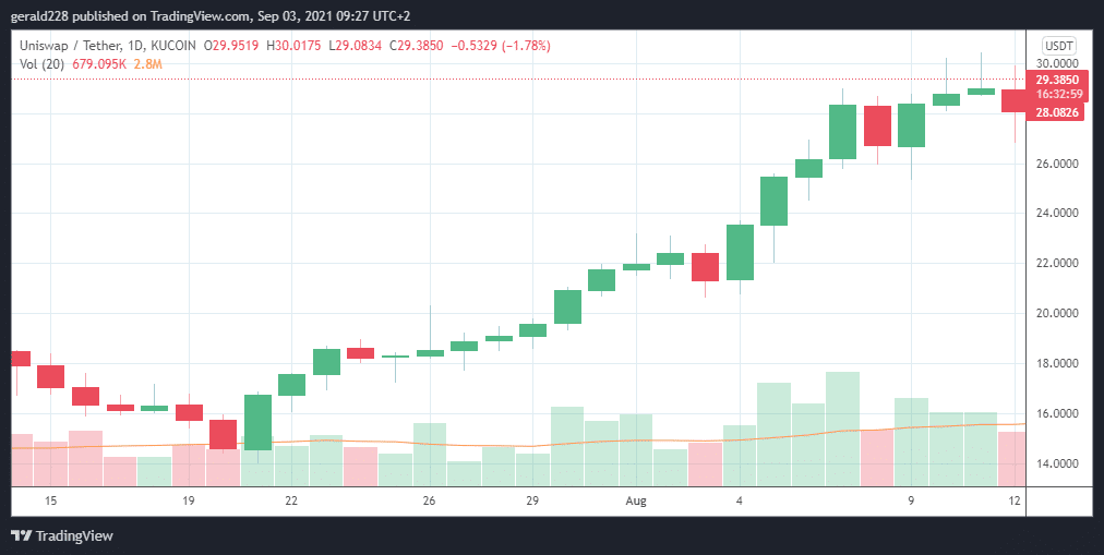 After having reached an impressive bi-monthly high of $31 on 1 September, the Uniswap price experienced an 8% decline to the $29.50 mark today. Although the drop seems to be sharp, the bullish tendency is still there with UNI having appreciated no less than 20% since its drop on 26 August.