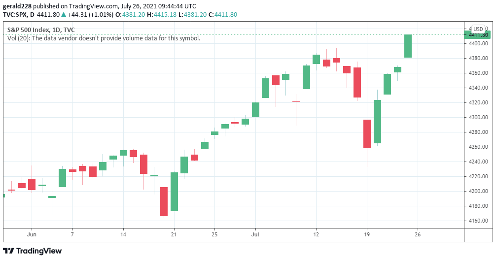 The S&P500 Price ended last week on a hugely positive note as investors continued to shrug off persistent high inflation worries and tepid job data. In fact, the S&P price soared from an intra week low of 4258 on 19 July to a high of 4411 on Friday’s close – a jump of nearly 5%.