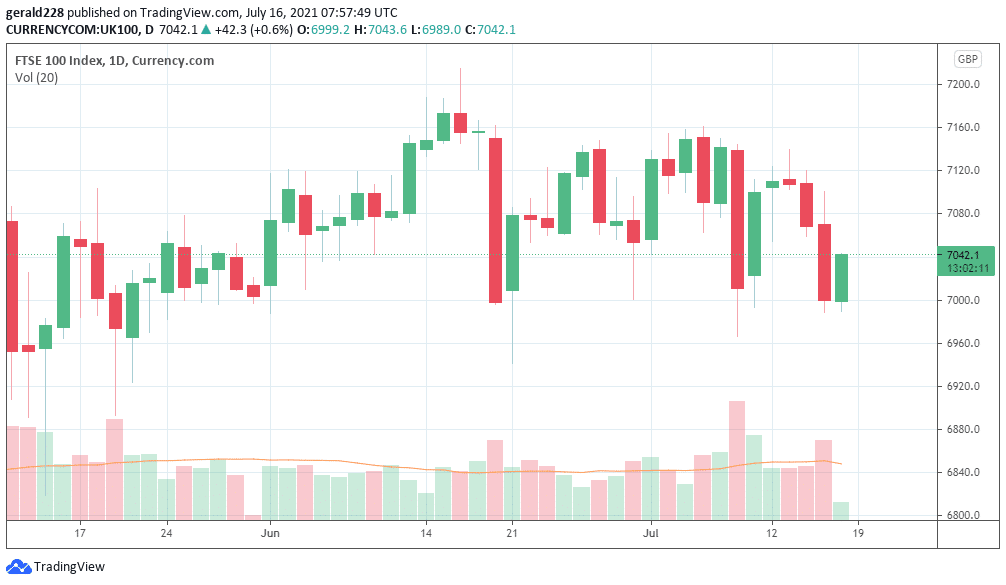 The FTSE price has been on a consistent downtrend since 14 July where it fell from a high of £7110 to £7014 or a bit more than 1%. It recovered slightly to the $7035 mark this morning and looks poised to make further gains across the session. Anticipation for Monday’s re-opening will undoubtedly add some feelgood factor to the index but pitfalls remain.