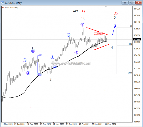 From an Elliott Wave perspective, we see Aussie still in the middle of a big triangle that can send prices higher in June, once the A-B-C-D-E triangle is completed in wave four. Pair is also supported by 200 daily SMA.