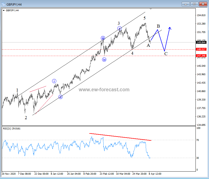GBPJPY is reversing sharply down after reaching a new high above 153.00 which makes us think that higher degree impulsive is finished and that new corrective set-back is unfolding. Corrections are always made by a minimum three legs; A-B-C move, so it makes sense for us to expect even lower prices in the near-term if we consider that drop is impulsive, thus wave A that will bring more weakness later after wave B rally. Normally, when correction occurs, the price can return back to the former wave four, meaning we may see weakness to 148.40 or maybe even towards 147.40 levels. We would avoid any long positions for now, as these should wait untill A-B-C move is completed.