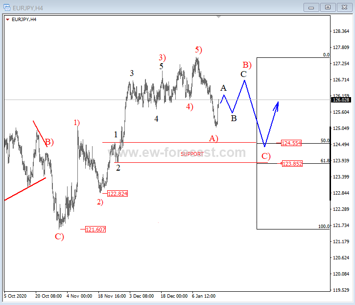 Today we will talk about EURJPY, its price action from technical point of view and wave structure from Elliott Wave perspective. If you are familiar with EW, then you know that after every five waves, a three-wave corrective setback follows before we may see a trend continuation, in this case bullish one. And as you can see on the 4h chart below, EURJPY made nice and clean five-wave recovery from 121.60 lows which actually confirms a bullish trend. Well, after recent sharp and strong decline, it seems like it’s trading now in an (A)-(B)-(C) correction that can send the price back to 124.55 – 123.85 support zone from where we can expect aanother resumption of an uptrend.