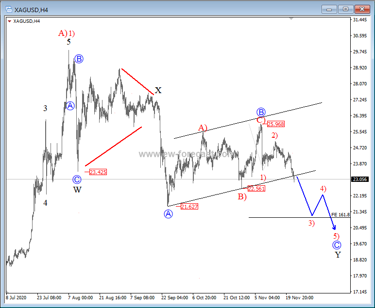 Silver is trading in a bigger, complex W-X-Y correction, down from August highs. At the moment we are tracking a sub-wave C of Y, down from 25.97 level, where sub-wave B correction fully unfolded its three-wave move. Wave C is an impulse, therefore five legs towards the 20.0/19.5 region can be seen this or at the beginning of next month before a bigger correction can be regarded as completed, and more upside may start to develop. That said, the price started to break below the lower corrective channel line, and is now approaching the 22.56 level, which means wave C is underway on the metal, and more weakness in view.