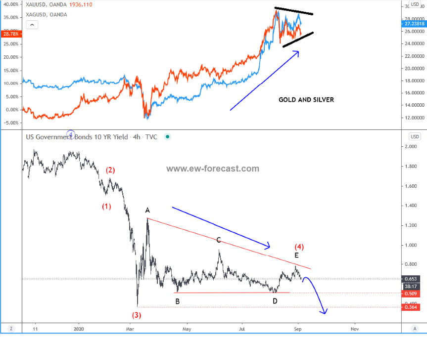 The Treasury yields are seen in corrective, sideways price action. It looks like a triangle that is a continuation pattern, so more weakness here means higher prices on the 10 year US notes, so at the same time, there might be new support coming on metals. 1800 is a nice level for XAUUSD while XAGUSD has it around $23.00, unless it is a triangle on both, then the price will move sideways rather than deep, before going up.