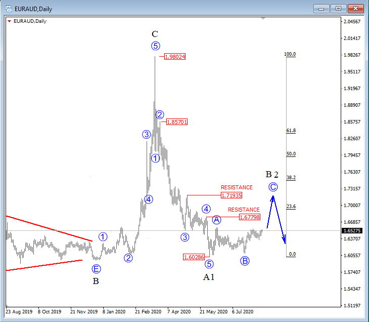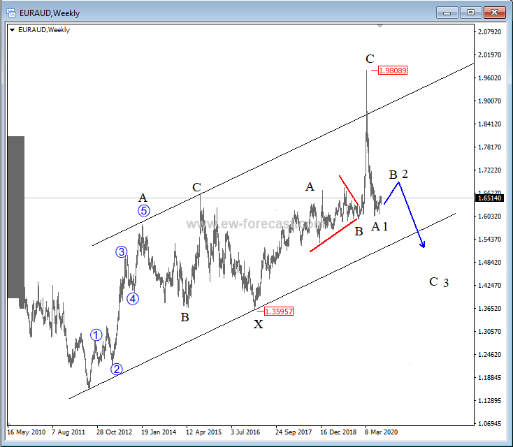On the daily chart of EURAUD, we see a possibly finished wave A/1 at 1.602 level, meaning a three-wave corrective recovery as B/2 may show up in weeks to follow. Resistance for correction can be at 1.678/1.746 level or higher.