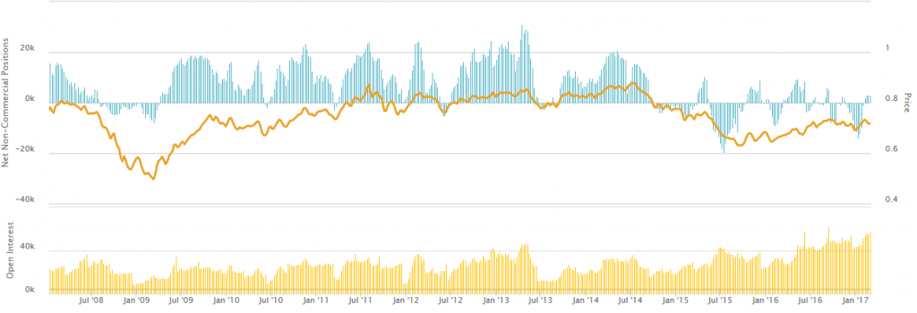 NZDUSD has now retraced nearly all of its 2017 gains while the trade weighted index has actually fallen into negative territory. Referring to positioning data shows that, while positioning has fluctuated greatly over the last year and a half, there is plenty of room for downside engagement in NZD as institutional investors are currently net long the currency.