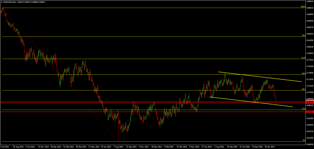 Following the large decline from 2014 highs, NZDUSD spent all of 2015 and a large part of 2016, correcting higher. The correction made it all the way back up to the 50% retracement from 2014 highs before downside resumed and price started to trend lower again. The key local support in NZDUSD is at the .6856 level which is the December 2016 low.