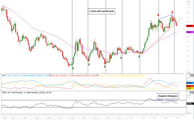 As seen above in monthly chart, the two years and the 5-month cycle has precisely worked to catch the bottom in last eight years. Now, the same cycle worked to gauge the top and recently in the month of March 2017 it has provided the signal for the top. Furthermore, the index exhibited the negative divergence on momentum oscillator RSI of 14 months. This suggests the weakness in the index.