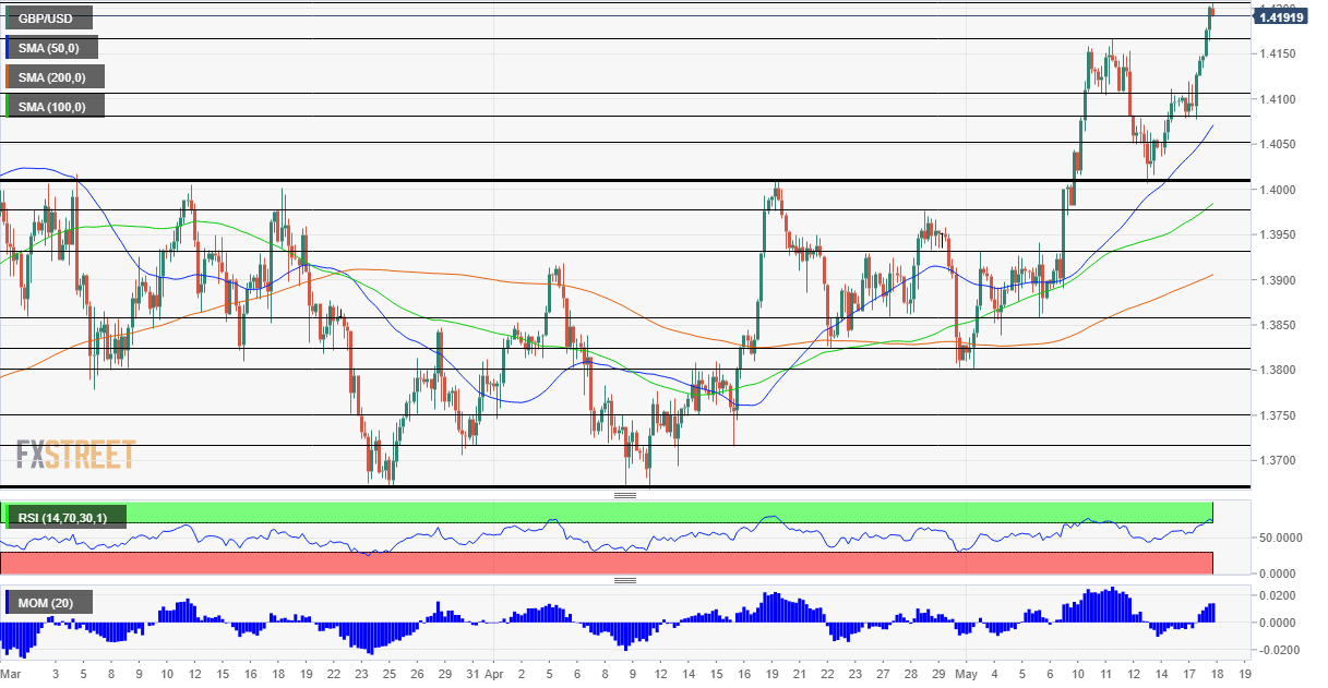Pound/dollar has entered overbought territory according to the Relative Strength Index (RSI) on the four-hour chart. It has topped the 70 level. On the other hand, momentum is to the upside and the currency pair is also trading above the 50, 100 and 200 Simple Moving Averages.