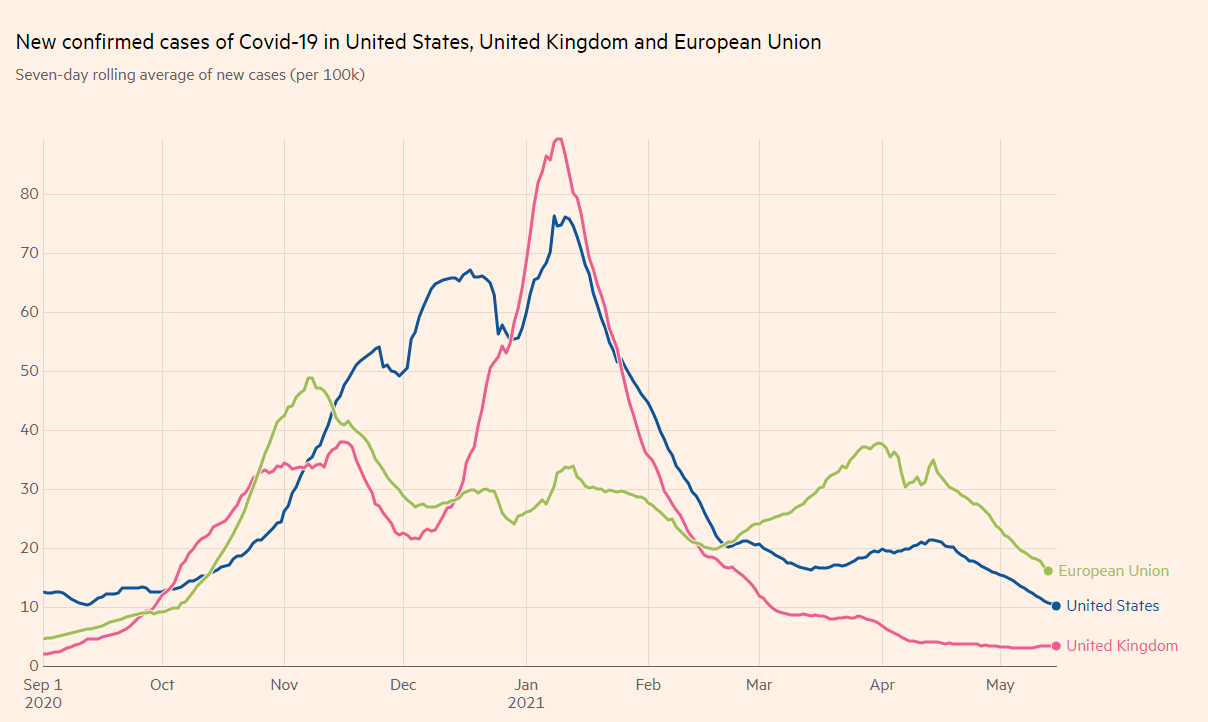 The old continent has been accelerating its vaccination campaign, reaching over a third of the population with at least one dose. Moreover, the campaign is bearing fruit, pushing infections sharply lower: