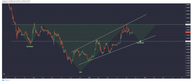 With DeFi finally cooling off a bit, the ETH/BTC trading pair is also targeting a retest of former resistance turned support, which also coincides with the bottom of a broadening wedge trendline, and what would form the right shoulder on a massive inverse head and shoulders pattern.