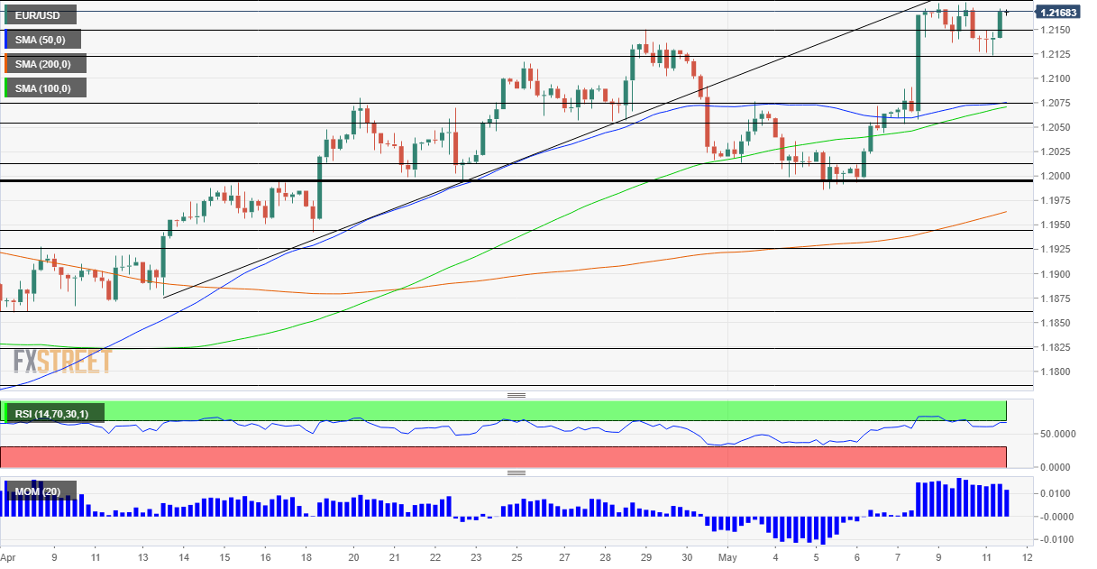 Support is at 1.2150, the April peak, and then at 1.2125 and 1.2075. Further down, 1.2050 and 1.2015 await EUR/USD bears.