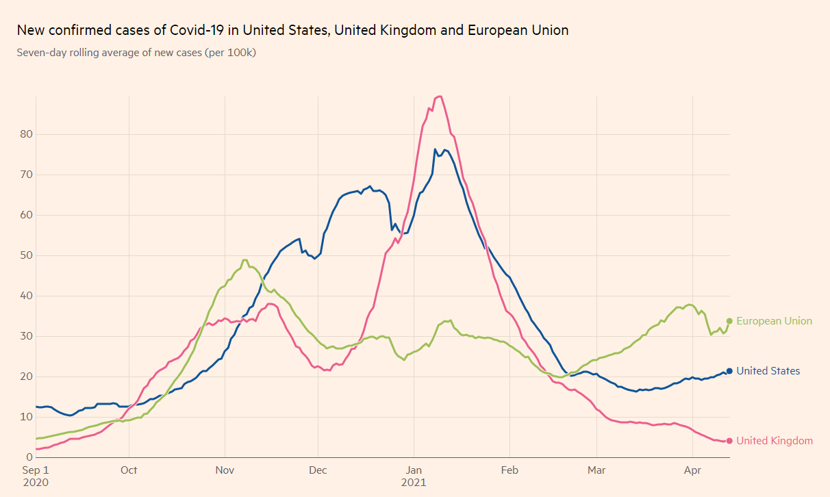 In the US, infections are edging higher, albeit at a moderate pace. At the time of writing, nearly half of Britain’s population received at least one vaccine shot, while America’s rate is below 40%.