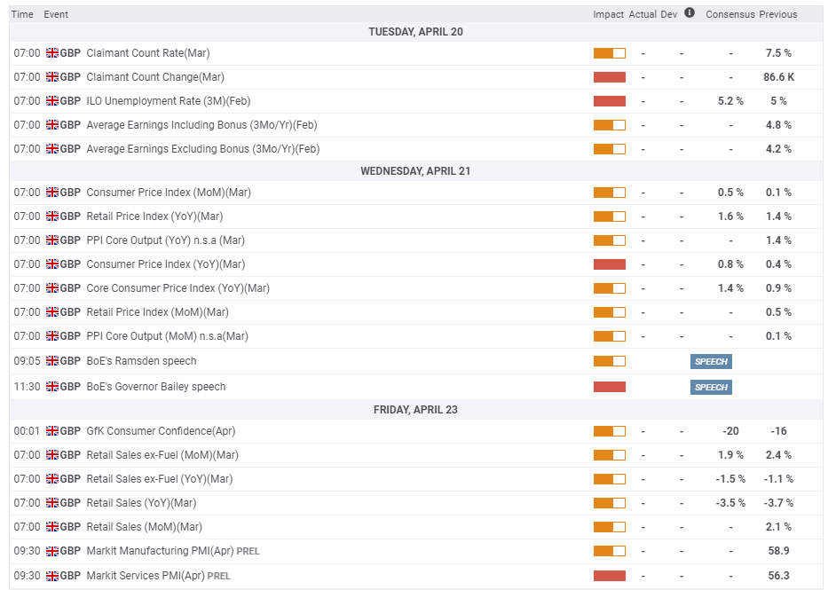 While shots go to arms, top-tier economic data is set to rock sterling. Economists expect an increase in the Unemployment Rate from 5% in January to 5.2% in February. Investors will also be eyeing the Claimant Count Change for March after February’s worrying leap of 86,000. The government’s furlough scheme has kept the labor market afloat.
