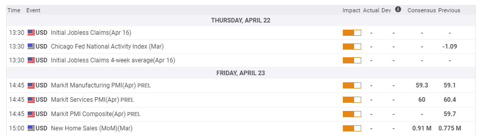 After the flurry of consumer data, the calendar is lighter. Weekly jobless claims stand out, and Markit’s preliminary PMIs for April could also rock the dollar, especially if they exceed their upward swing. New Home Sales will likely remain robust as the “race for space” – larger homes for those working at home – is in full gear.