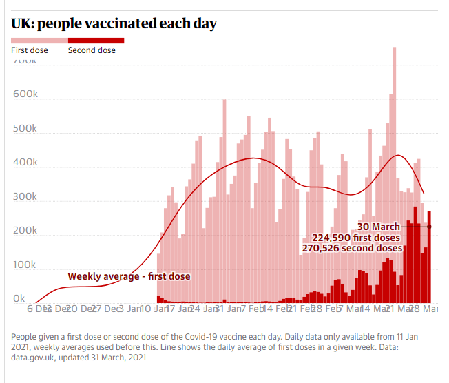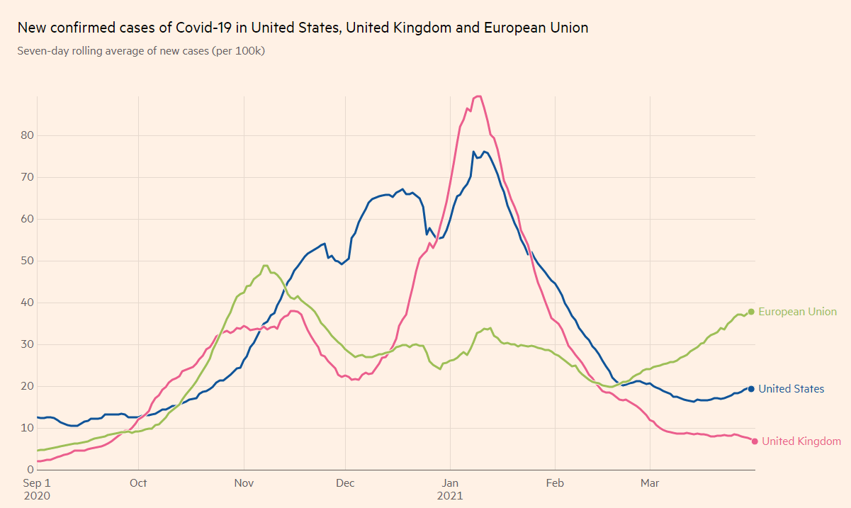 Up to 15 million Johnson & Johnson vaccine doses were spoiled – but that is unlikely to derail America’s vaccination campaign, which has reached 30% of its population with at least one dose. President Biden said that 90% of his compatriots will be offered the jab by April 19, and the pace has been impressive so far.