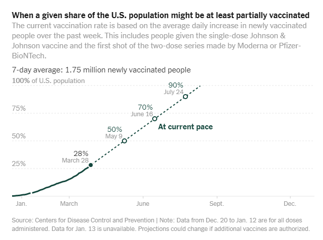 The goal of offering immunization to every American by May 1 seems feasible as more and more states have already achieved that milestone. At the current pace, doses will reach the arms of half of the US by May 9.
