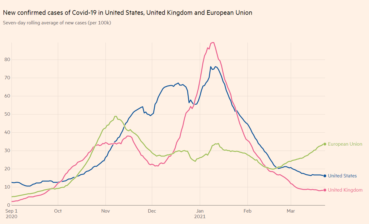 The gloomier market mood is also fueled by growing concerns about global growth due to Europe’s sluggish vaccination campaign, which is partially fueling another wave of COVID-19 cases in the old continent. EU leaders are venting frustration at British-based AstraZeneca and the UK. Britain’s cases continue falling.