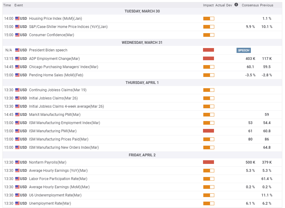 In the latter half of the week, the focus shifts to the Nonfarm Payrolls report for March. Economists expect an acceleration in hiring to 500,000 after 379,000 in February. As long as participation remains low, any decline in the Unemployment Rate will probably be disregarded by markets.