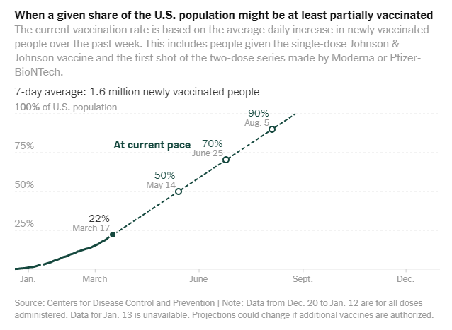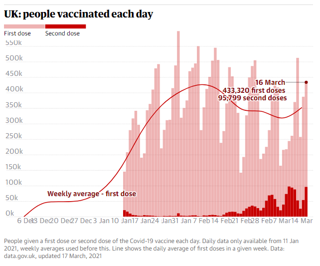 Around 38% of Brits have received at least one vaccine dose – and only 2.6% the second dose. With supplies now slowing, the government has shifted to prioritizing second jabs for the vulnerable. As the chart below shows, the UK is advancing in the second round, yet there is still room to go.