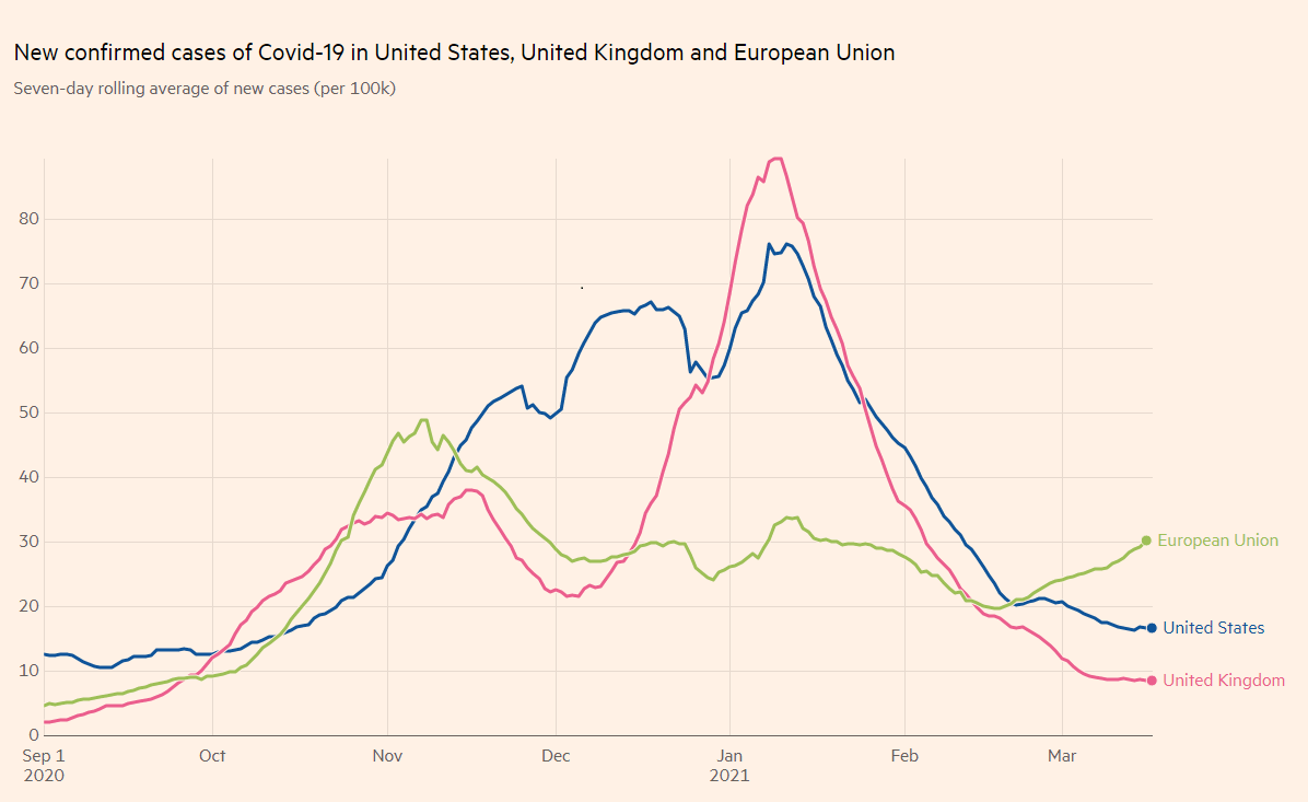 America’s vaccination campaign continues moving at a rapid clip, with around 23% of the population having already received one shot. The timetable for reaching the majority of the population has squeezed with the US set to reach the 50% mark by mid-May. Ongoing progress would boost the dollar while any potential setbacks would do the opposite.