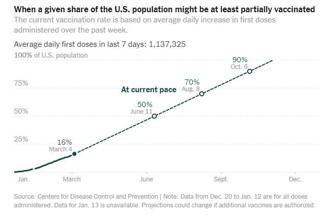 Biden set a low bar of inoculating 100 million Americans in his first 100 days, and he is nearing that goal. After the bump caused by the “deep freeze” storm, over two million Americans receive a jab every day. An additional acceleration would be cheered by markets.